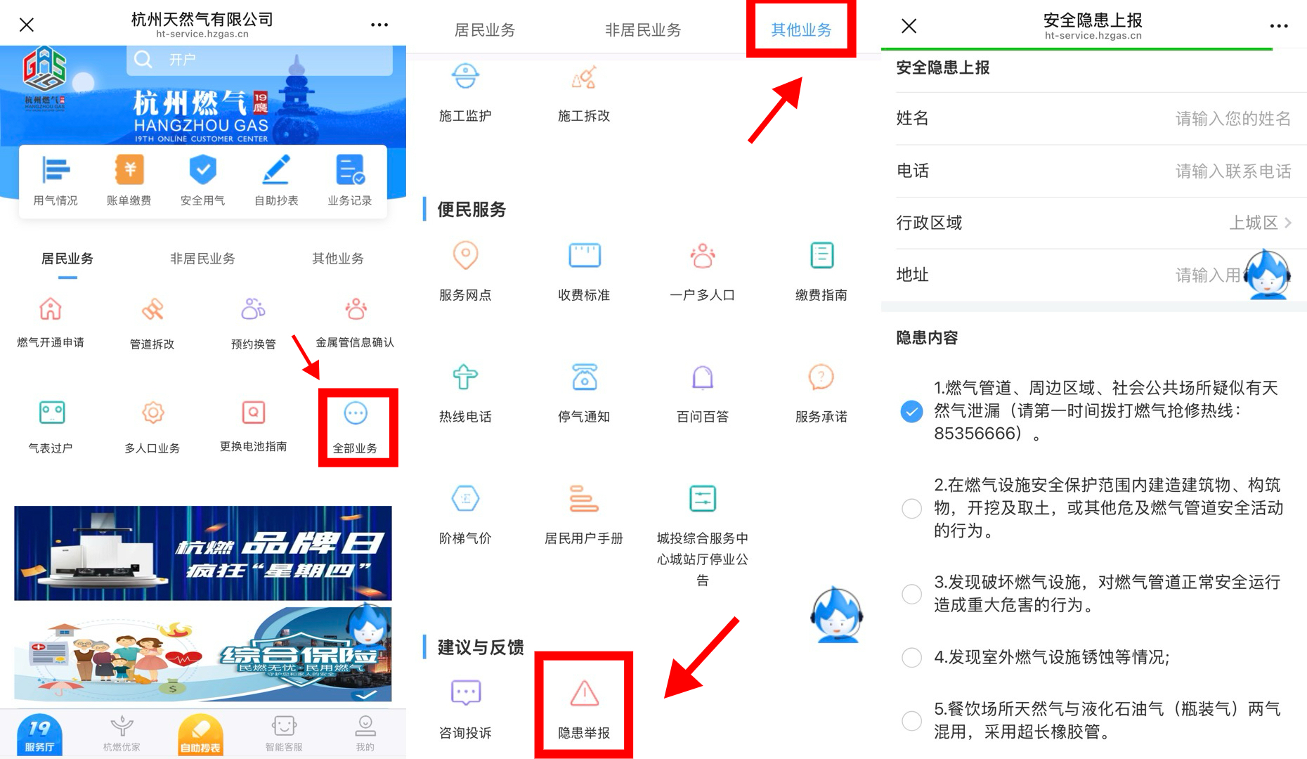 ①關(guān)注“杭州天然氣有限公司”微信公眾號(hào),進(jìn)入“19 服務(wù)廳”,選擇“其他業(yè)務(wù)”→“全部業(yè)務(wù)”→“建議與反饋”→“隱患舉報(bào)”即可;
